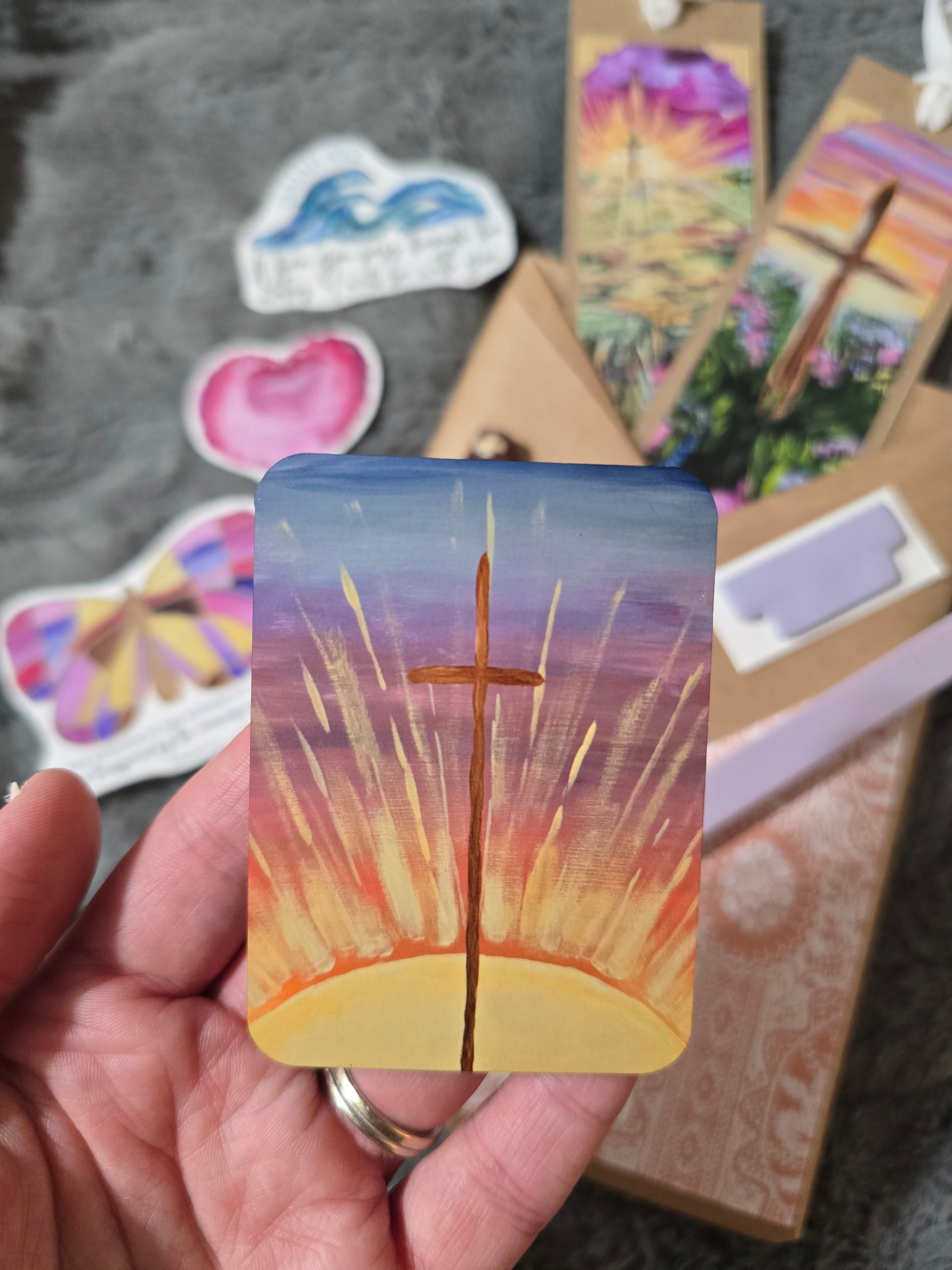 This bundle comes with one Christian faith based book, two artwork bookmarks, one artwork magnet, one highlighter, three waterproof vinyl stickers, note tabs, and a mini Jesus that you can keep or hide for somone to find!🥰