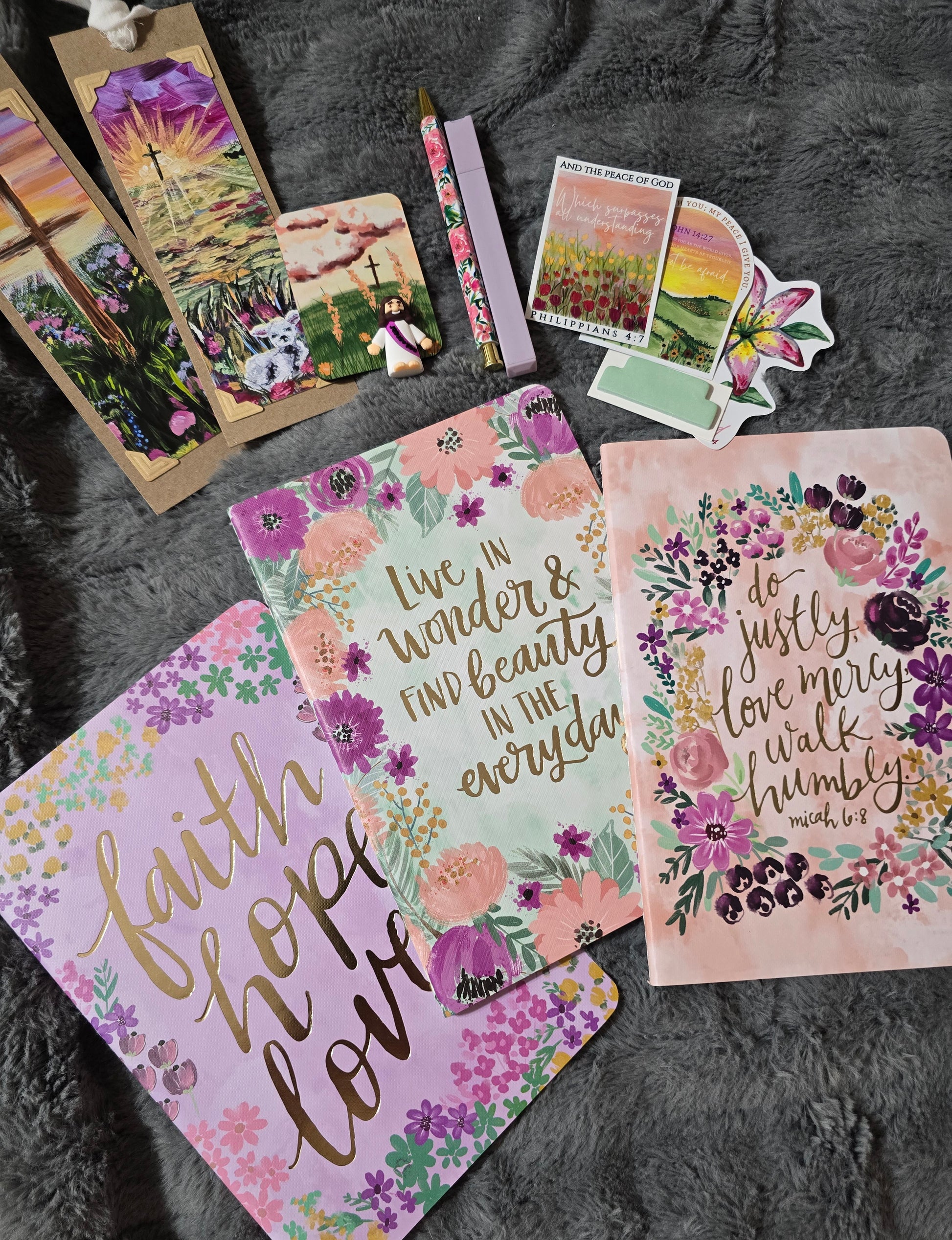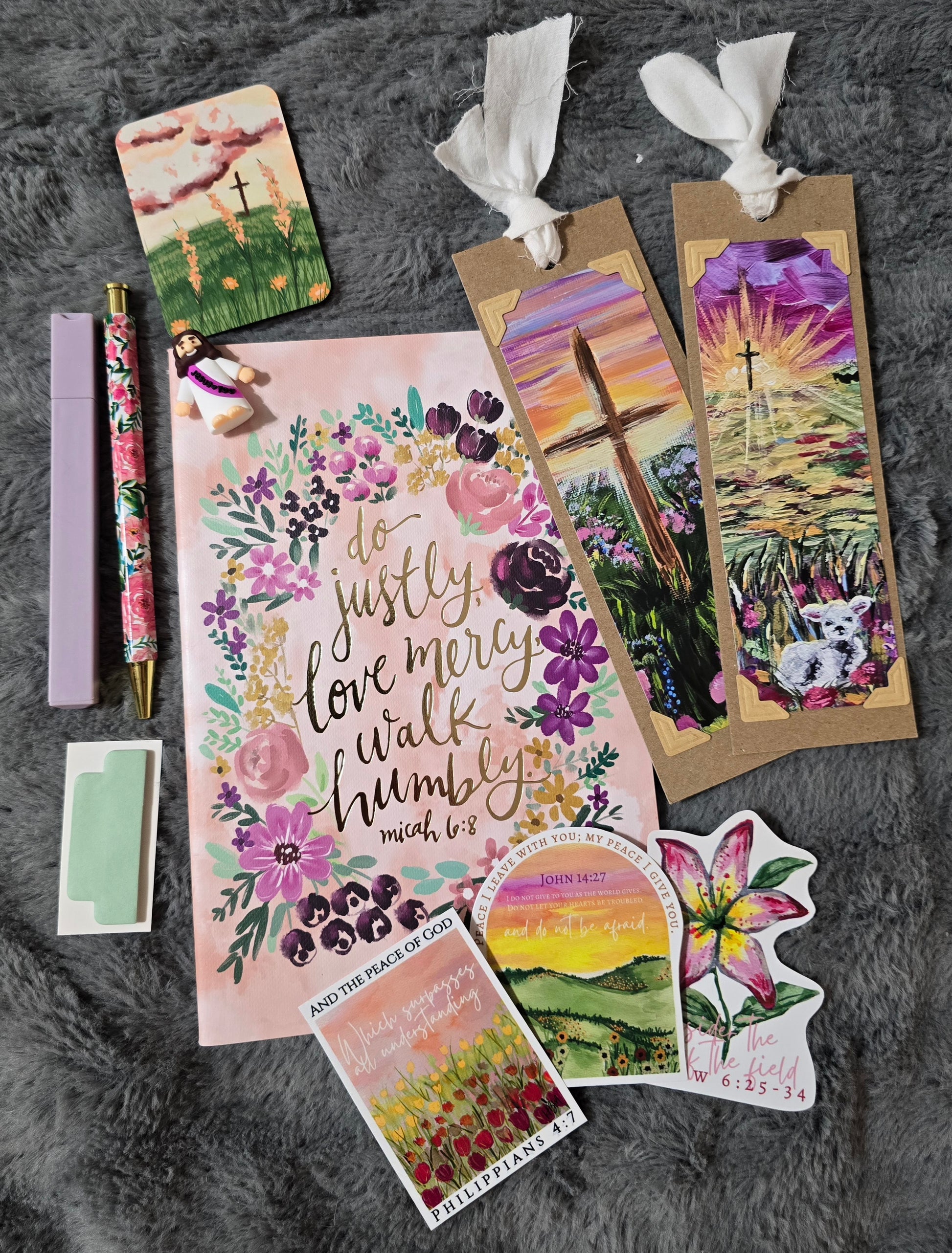 This bundle comes with one journal, two artwork bookmarks, one artwork magnet, one highlighter, one pen, three waterproof vinyl stickers, note tabs, and a mini Jesus that you can keep or hide for somone to find!🥰