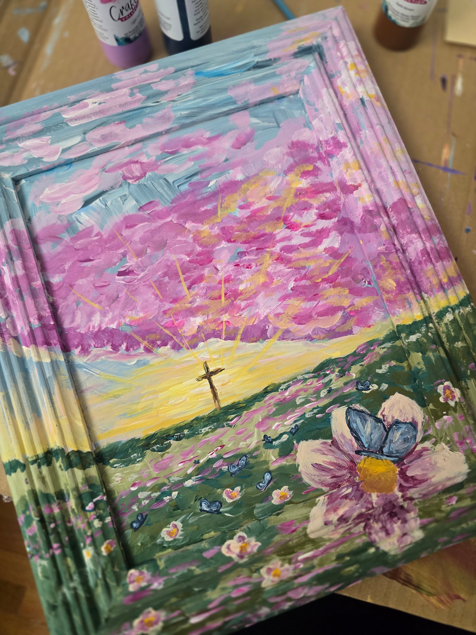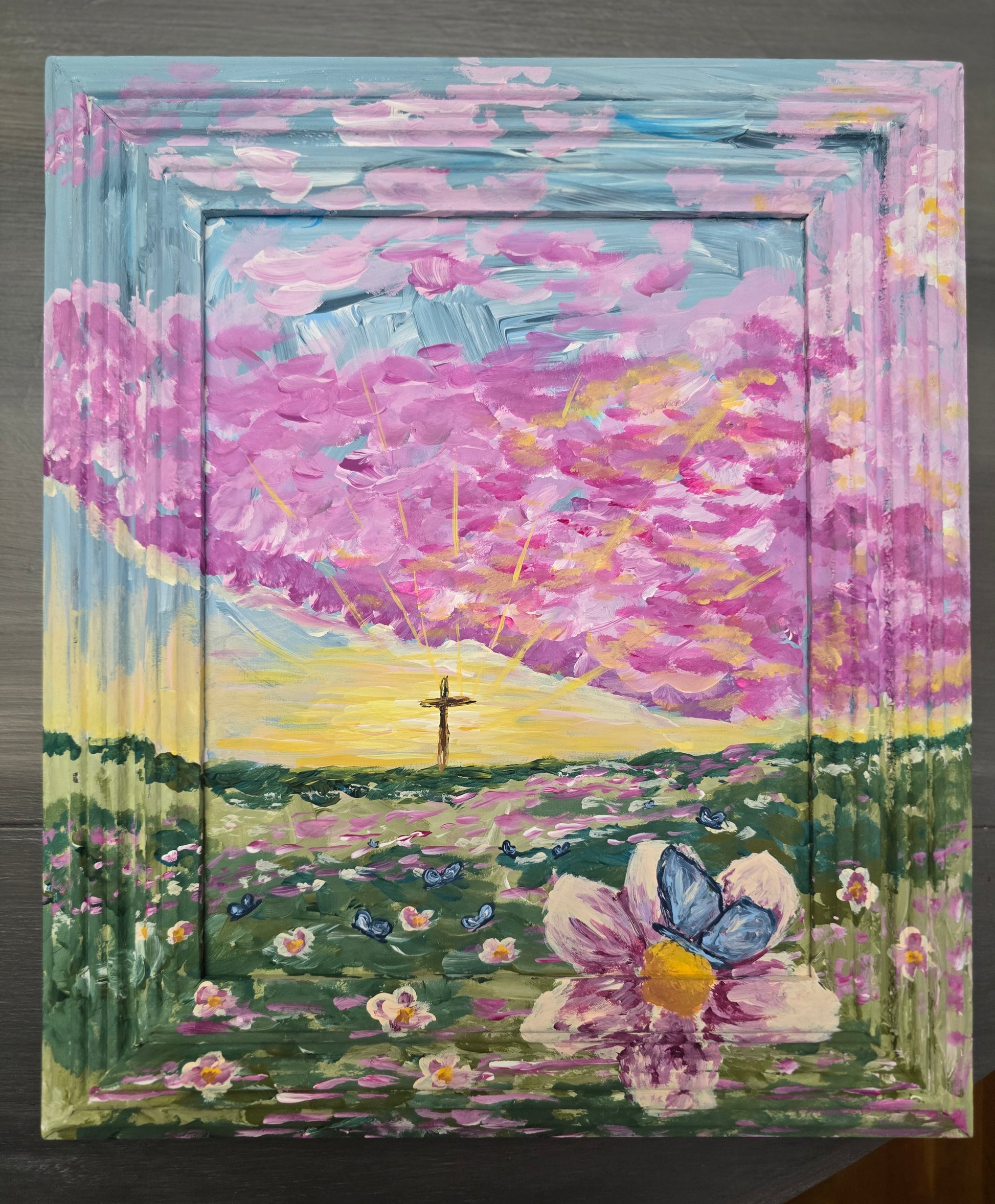 Material- Original painted canvas artwork in a painted wooden frame.