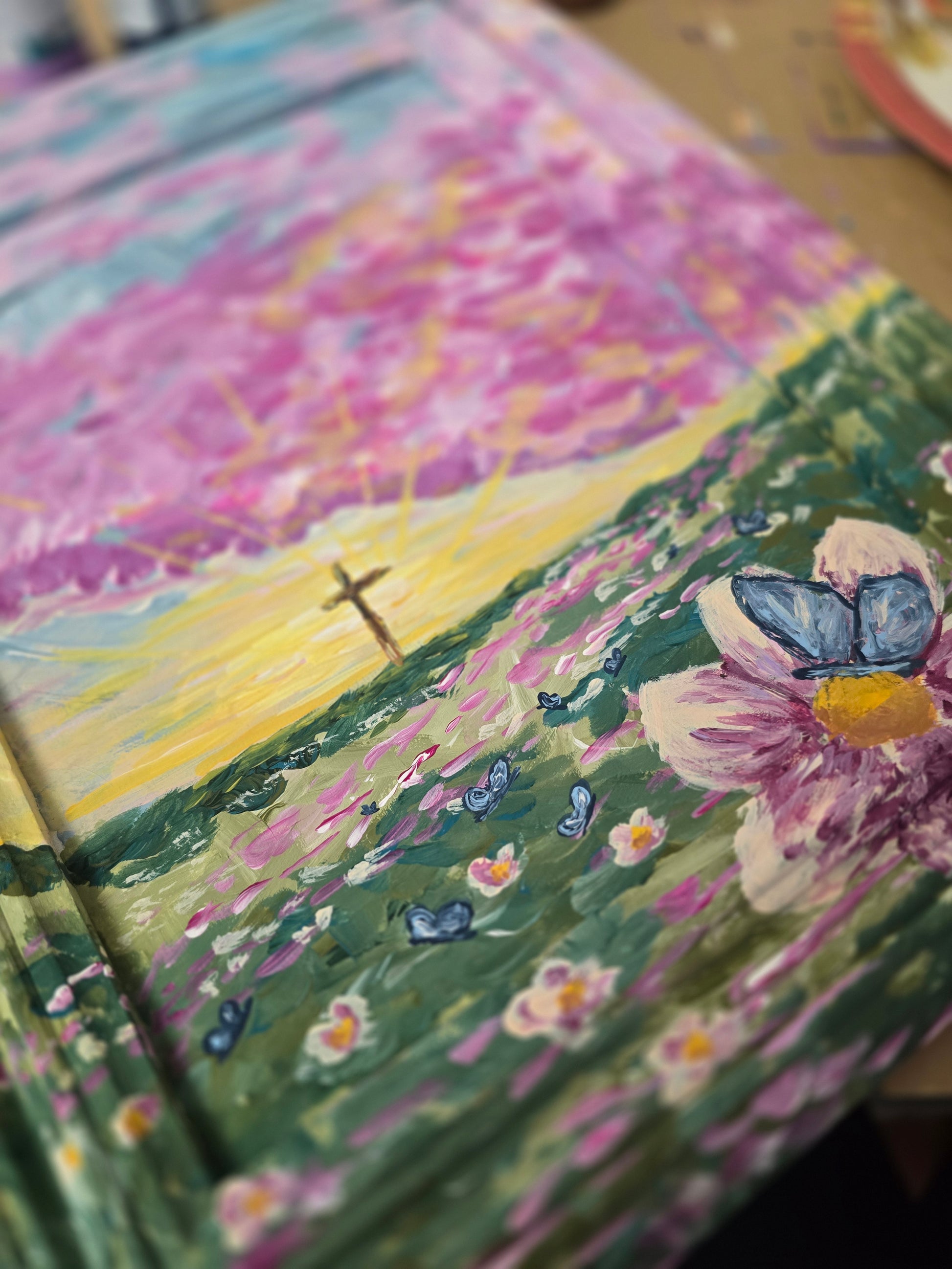I first stumbled upon Honey Bee Mine through a Facebook ad only a couple of hours before this auction closed, and I was instantly captured by this beautiful butterfly painting! 🩷 It somehow felt perfectly like "me," and when I noticed the wings were painted to look like stained glass and it was titled "Be Transformed," I fell even more in love with it 😍 I instantly knew where I'd hang it, and I was thrilled when I won the auction! It was packaged really well and even came with some lovely stickers, a DaySpring journal page with an encouraging word, and a beautiful business card 💝 I also didn't realize this until I received it, but the back is sealed really nicely and has the Lord's prayer printed on it! What a wonderful touch! I highly recommend this seller. Thank you so much, Caitlin!! 🥰