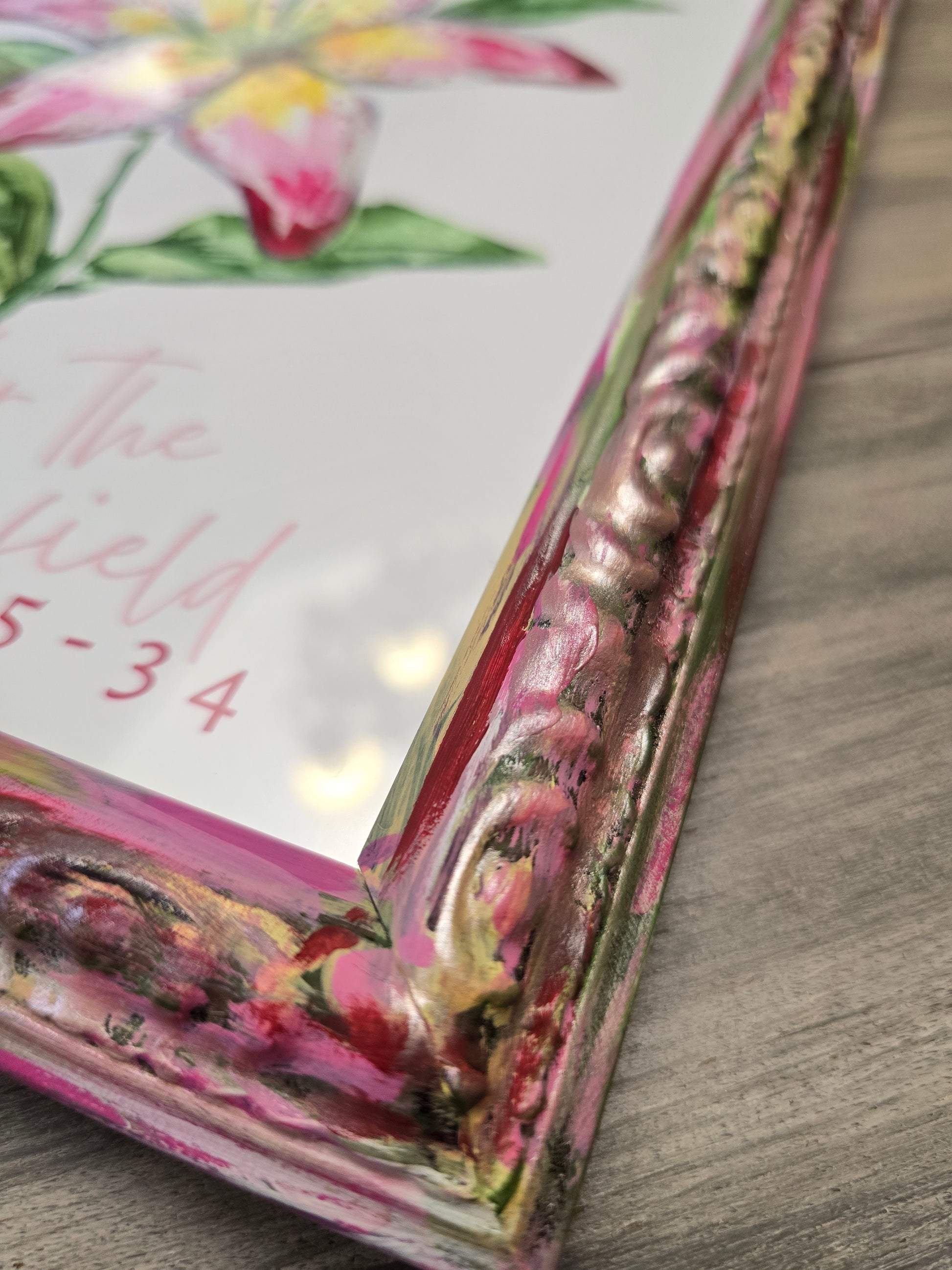 I first stumbled upon Honey Bee Mine through a Facebook ad only a couple of hours before this auction closed, and I was instantly captured by this beautiful butterfly painting! 🩷 It somehow felt perfectly like "me," and when I noticed the wings were painted to look like stained glass and it was titled "Be Transformed," I fell even more in love with it 😍 I instantly knew where I'd hang it, and I was thrilled when I won the auction! It was packaged really well and even came with some lovely stickers, a DaySpring journal page with an encouraging word, and a beautiful business card 💝 I also didn't realize this until I received it, but the back is sealed really nicely and has the Lord's prayer printed on it! What a wonderful touch! I highly recommend this seller. Thank you so much, Caitlin!! 🥰